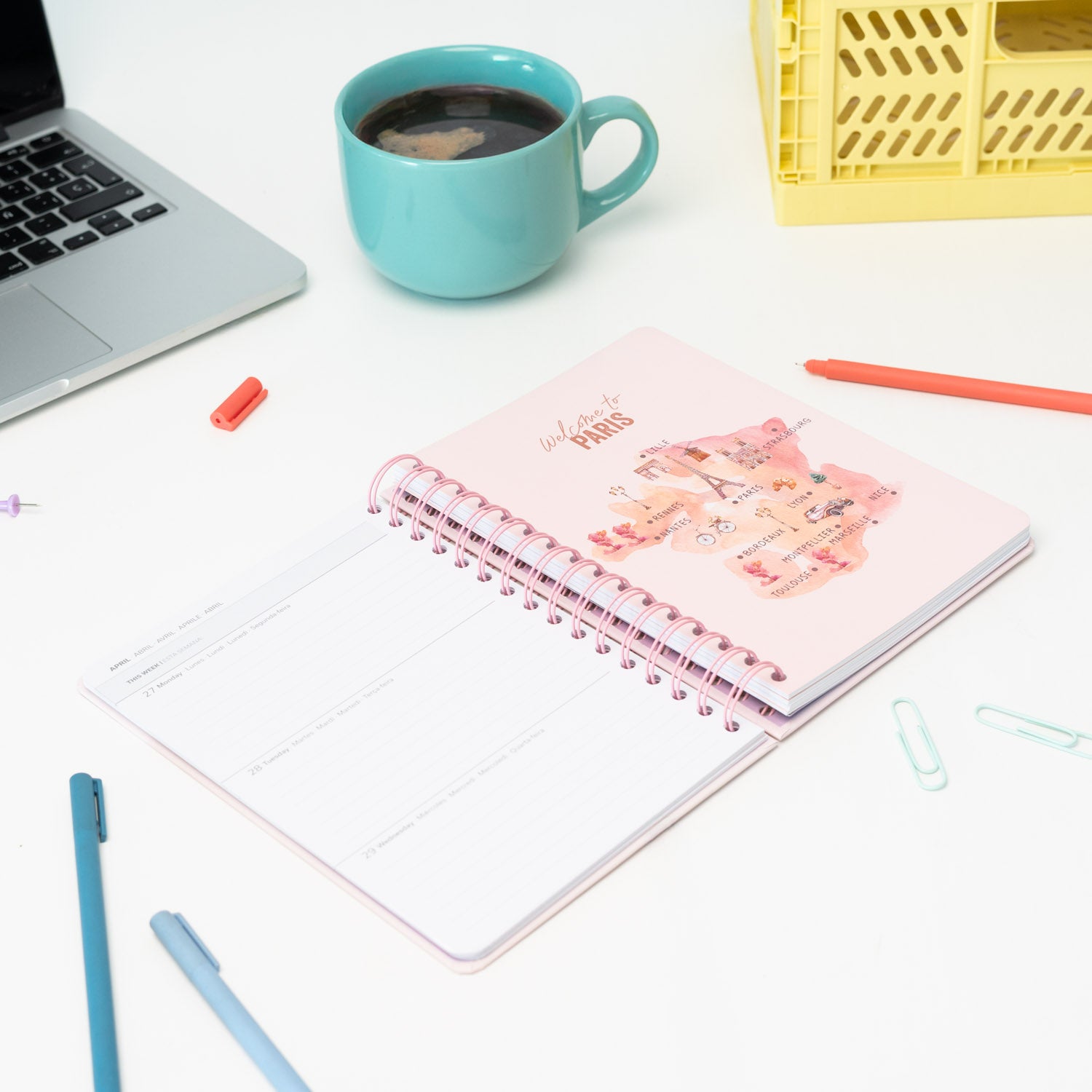 Agenda semanal 2026 com design delicado inspirado em Paris, com ilustração estilo aquarela de um café parisiense.